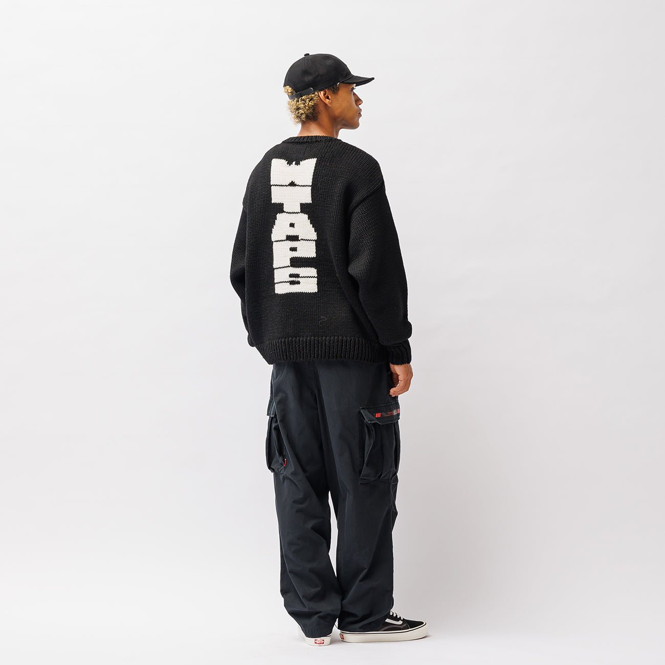 アコーディオン型のカーゴポケット右側に両端の斜線でサイズを表記するプリントネームを付属。