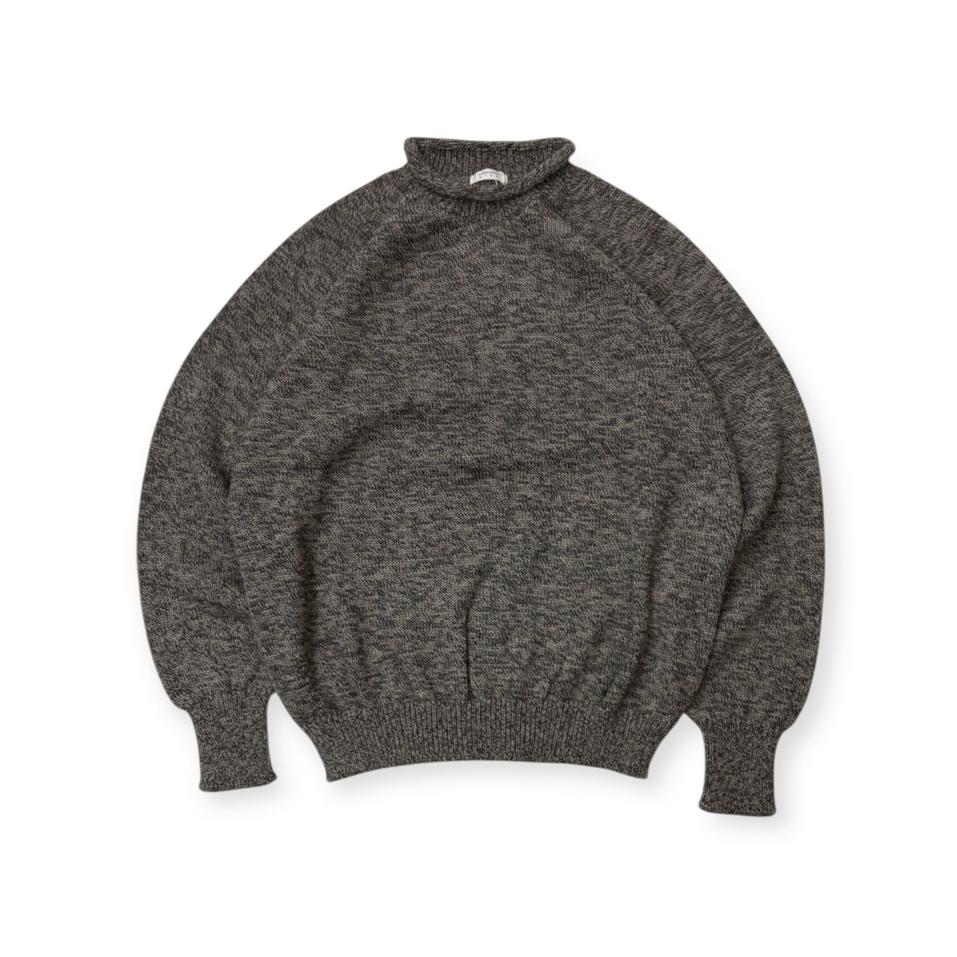 ネックが高く設計されていて、かつカーリングしている独特な見た目のアルパカ100%の高級感あるニット。