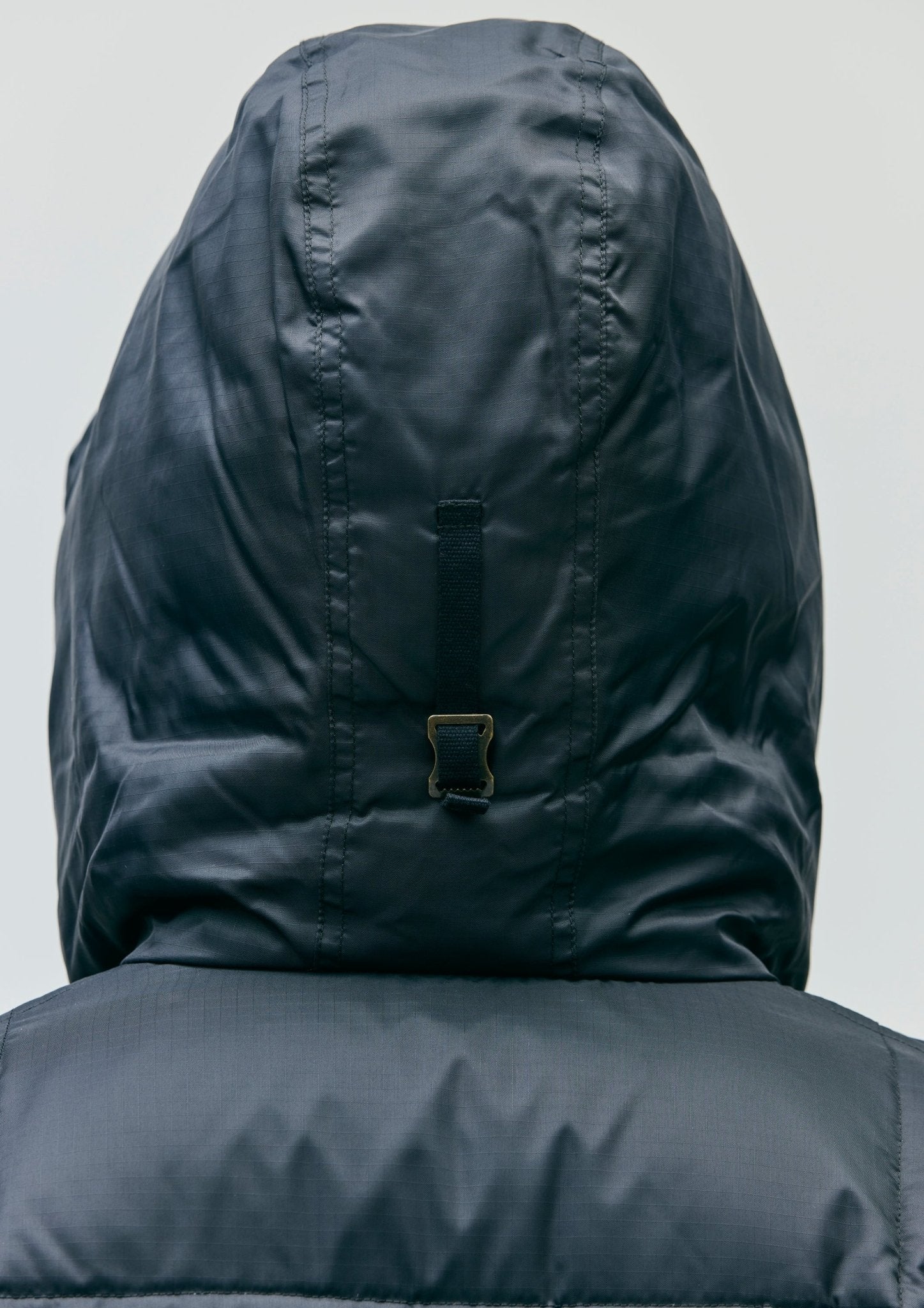 ハリとコシがあり、鈍い光沢感を持つナイロンリップストップ生地を使用したカラコラムダウンジャケット。