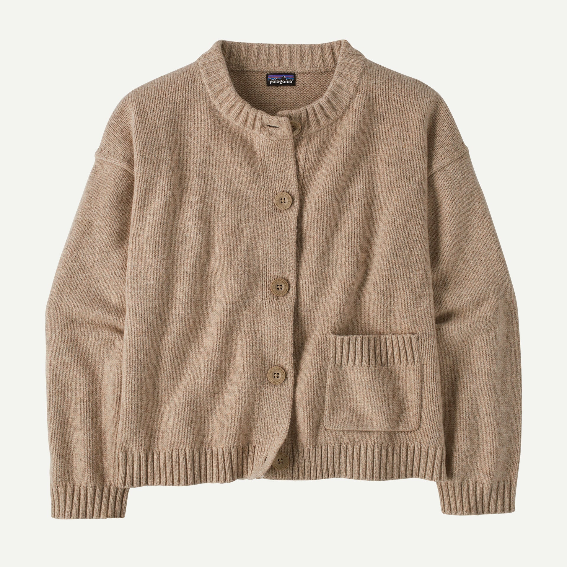 動きやすさと快適さを高めるために肩の縫い目をやや落とし、大きなボタンを付けたボクシー・フィットのカーディガン。