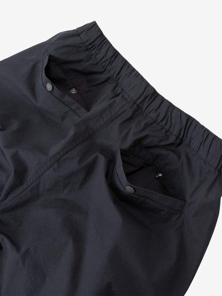 ワイドシルエットながら、裾のスナップボタンで裾幅を絞ることができ、足元の視界を妨げにくい仕様。