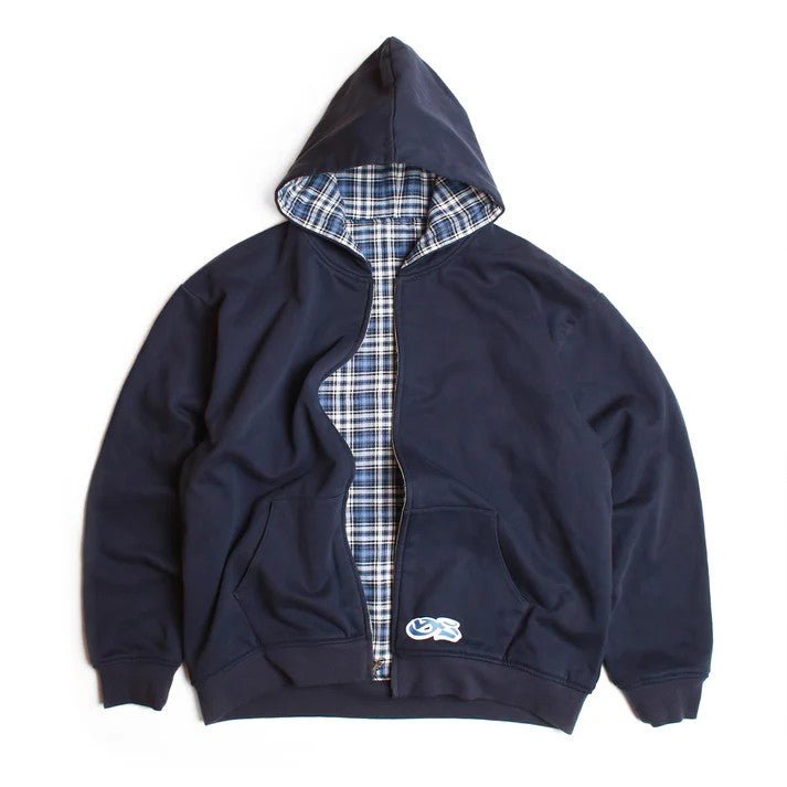 チェックと無地のリバーシブルフーディー。
