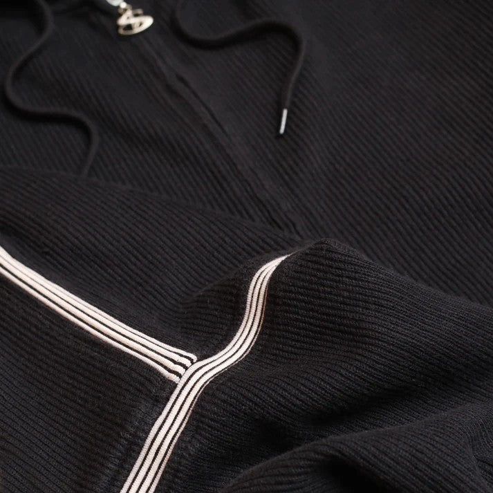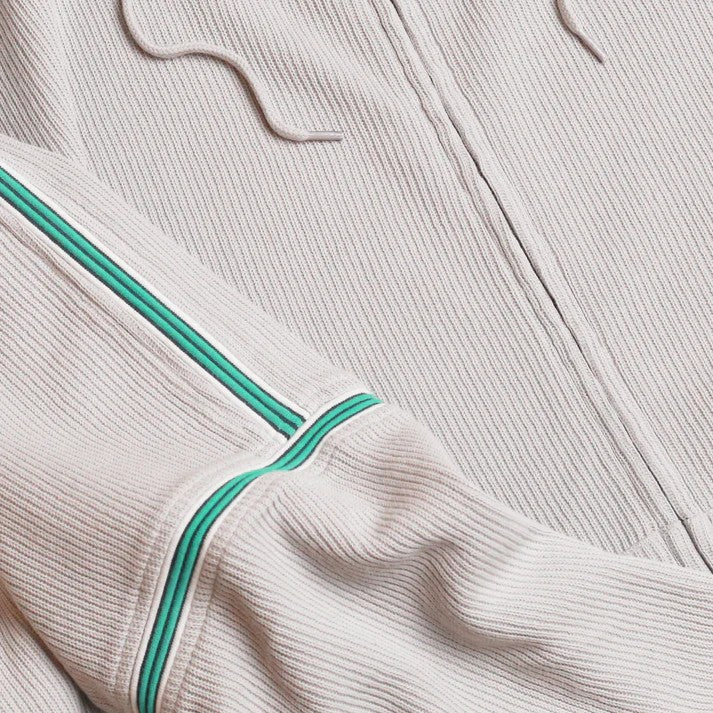 肩から肘にかけてラインが入っているリブ編みコットンフーディー。