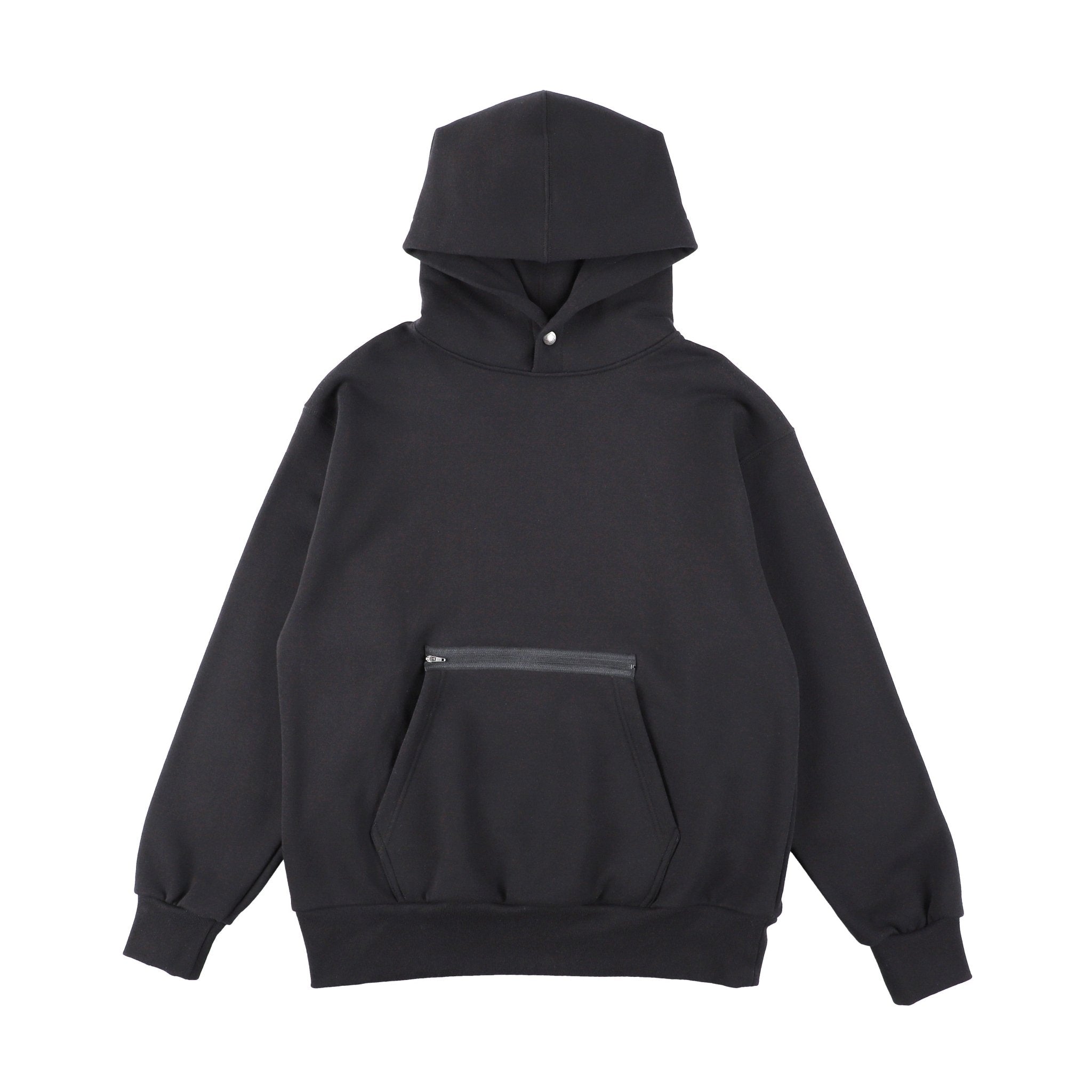 デザイン面では、首元に縦に並んだ2つのスナップボタンが特徴的。さらにフロントとバック両方に配されたカンガルーポケットは、フロント側が上部のファスナーポケットとサイドポケットで2層構造になっており、機能性と遊び心を兼ね備えたユニークなディテールです。