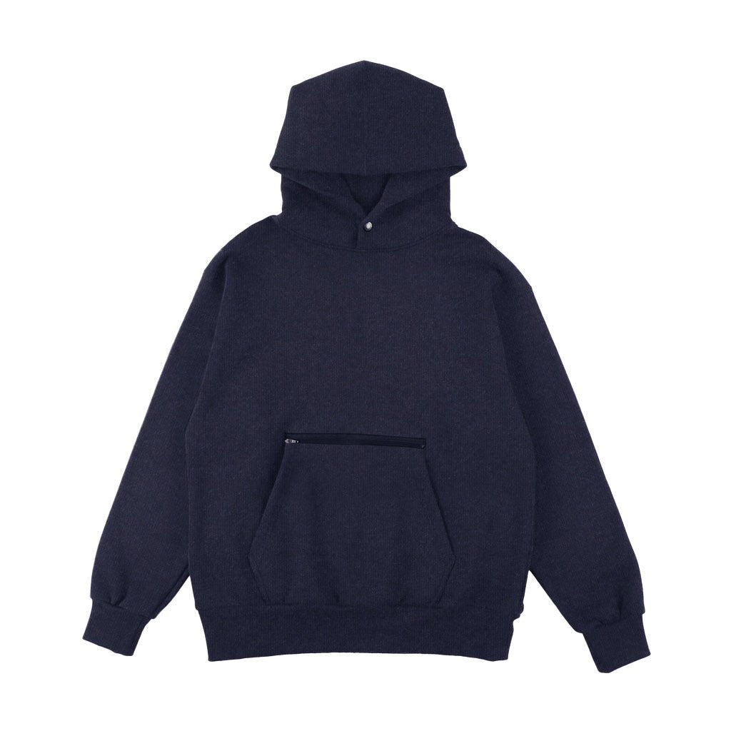 和歌山にわずかしか現存しない旧式の「アズマ編み機」(1970年代頃の初期型)を使用し、ヘビーウエイトの裏毛素材で仕立てたスウェットフーディー。