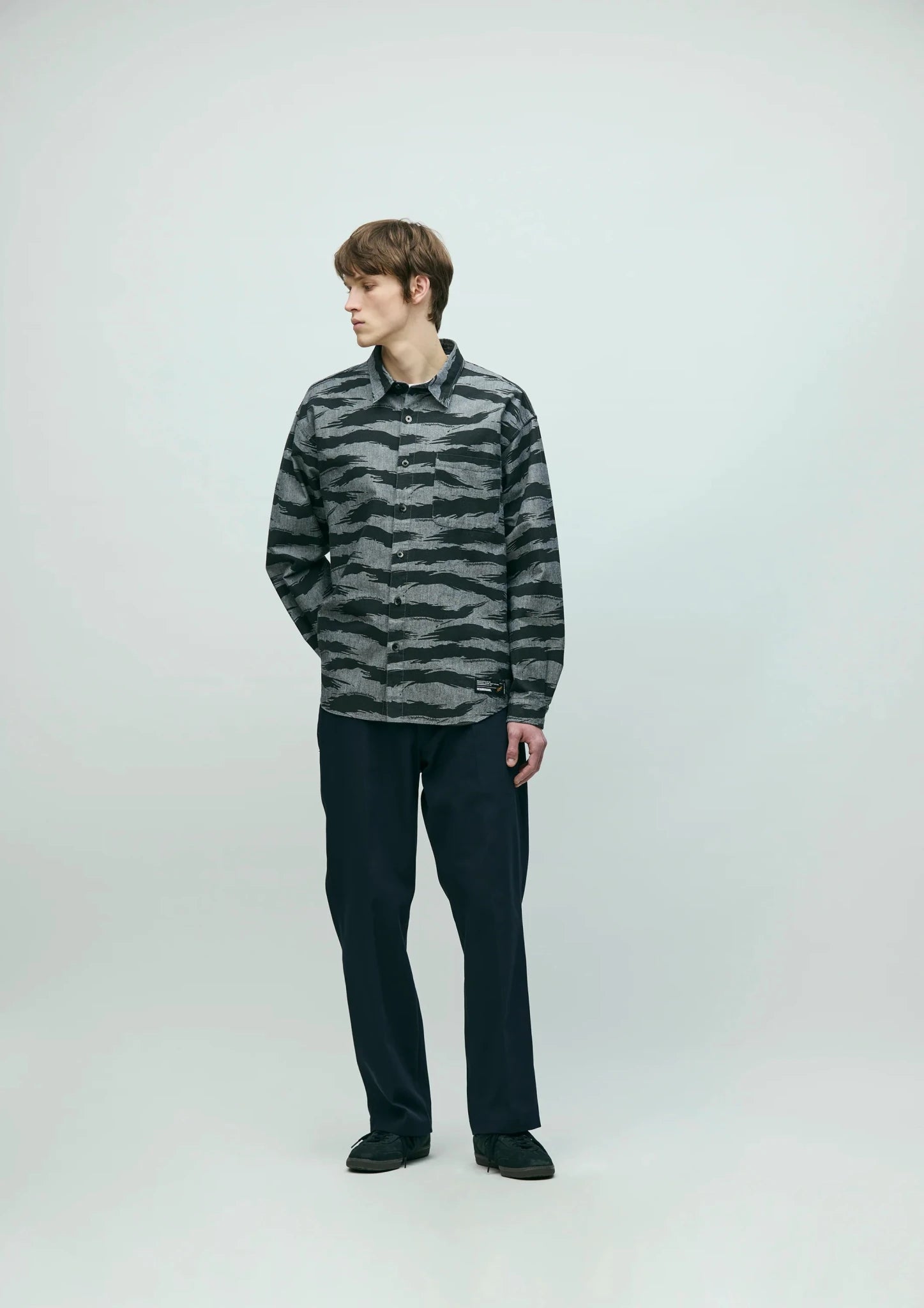シャンブレー素材にオリジナルカモ柄をプリントしたシャンブレーシャツ。