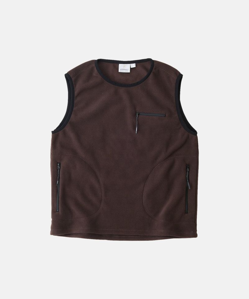 ジッパーポケットを3つ備えたプルオーバーのフリースベスト。